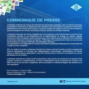 La Banque Centrale du Congo (BCC) a pris part, le 13 janvier 2026, à l’Hôtel Fleuve Congo de Kinshasa, à la réunion avec l’Association Africaine de Crédit Rural et Agricole (AFRACA) et à laquelle ont participé différents délégués des banques, des institutions de microfinance, des coopératives d’épargne et de crédit ainsi que de la Société financière de développement organisée. A l’ordre du jour : les défis liés à la finance rurale et les solutions à envisager.