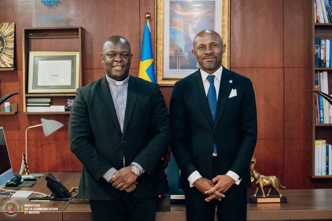 Le Recteur de l’université catholique de l’Archidiocèse de Kinshasa Omnia Omnibus, l’Abbé Christian Ngazain Ngelesa, a été reçu en audience ce lundi 20 avril 2026 par le Ministre de la Communication et Médias, Patrick Muyaya, dans son cabinet de travail.
