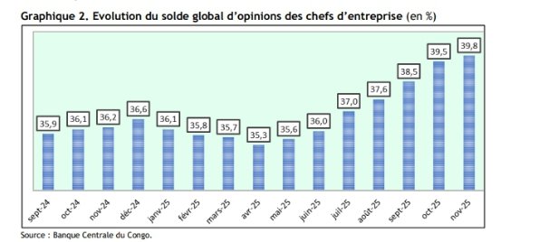 Au mois de novembre 2025, l’enquête sur le baromètre de conjoncture de l’économie congolaise indique que les chefs d’entreprise sont globalement optimistes quant à l’évolution du climat des affaires. Le solde global d’opinions pondérées s’est établi à +39,8%, contre +39,5% en octobre.