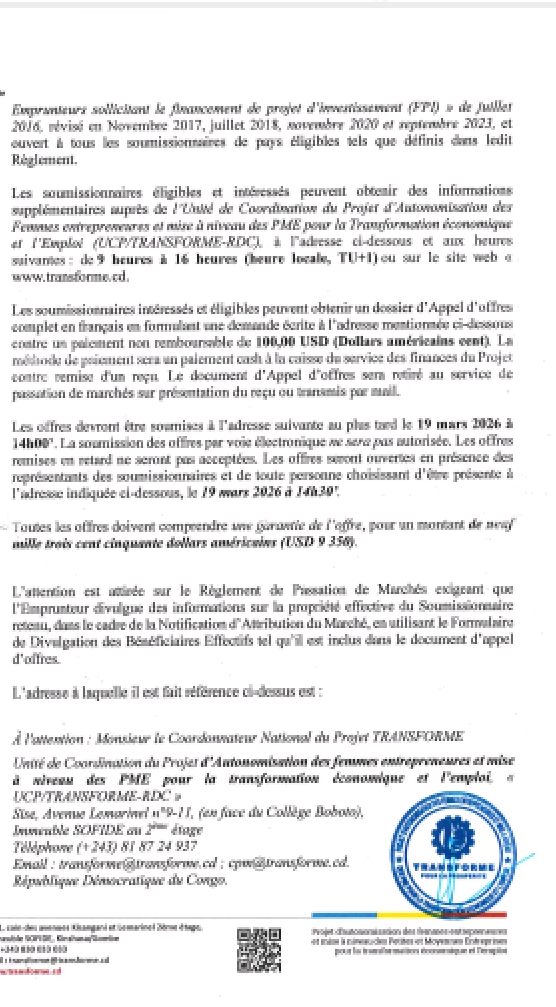 Adresse du Bureau: Avenue du marché n°3, Réf.: Boulevard du 30 juin en face de la grande poste (ex galeries Mwana Nteba), Kinshasa, Commune de la Gombe (RDC)