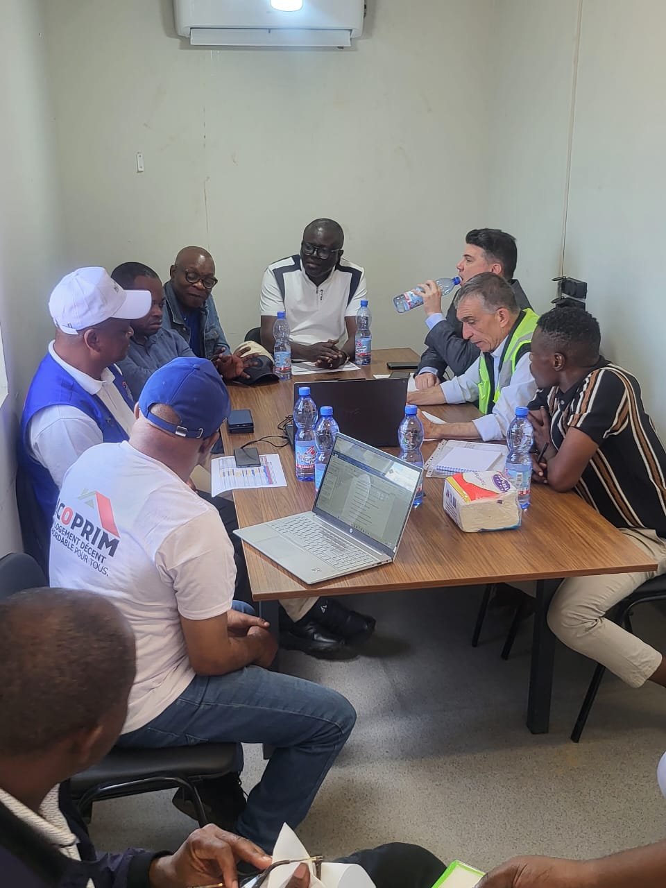 Sur place, le Directeur Général de l’ACOPRIM a tenu une réunion technique pour permettre non seulement au point focal du Ministre d’Etat, Ministre de l’Urbanisme et Habitat de s’imprégner du projet, en revue tout ce qui a été réalisé et ce qui reste à faire. Il a insisté sur le fait qu’aucun contenaire contenant les matériaux ne soit déplacé, hormis ceux qui sont vides.